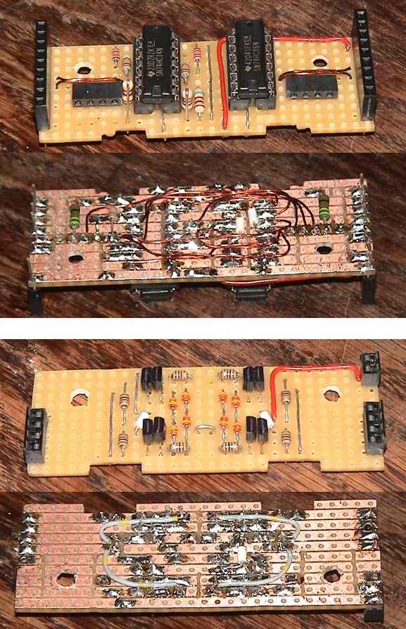 Im Zuge der Drahtverhauauflösung sind zwei Platinen entstanden. Die obere ist die HW Unterstützung für die Auswertung der beiden Mausenkoder; die untere die beiden H-Brücken. Bild hier Beide Platinen werden übereinander montiert und haben Steckkontakte für die Weiterleitung elektrischer Signale. Der Abstand zwischen den beiden ist so gering, daß ich bei mir keine passenden Buchsenleisten fand, ...
