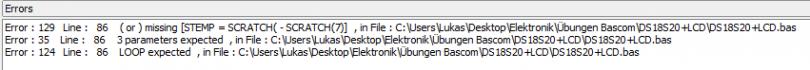 Hallo zusammen, ich bin neu hier im Forum und beschäftige mich auch erst seit kurzem mit Mikrocontrollern. Jetzt meine Frage: Ich versuche gerade einen an PORTD.7 an einen ATmega8 angeschlossenen DS18S20 zum laufen zu bekommen und die Temperatur auf einem 20*4 Zeichen Display von lcd-module.de auszugeben. Ich habe schon verschiedene Beispielcods ausprobiert, nur keiner funktioniert. Aktuell verwende ich den Code, den ich als anhang dabei hab, nur da bekomme ich eine Fehlermeldung. ...