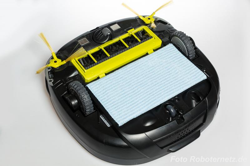 Um zu vermeiden, dass der HomBot mit dem Wischmopp fahren kann, erkennt ein Sensor einen Teppich und gibt den Hinweis, den Wischmopp zu entfernen. Leider klappt das offenbar bei sehr niedrigen Teppichen nicht immer!
