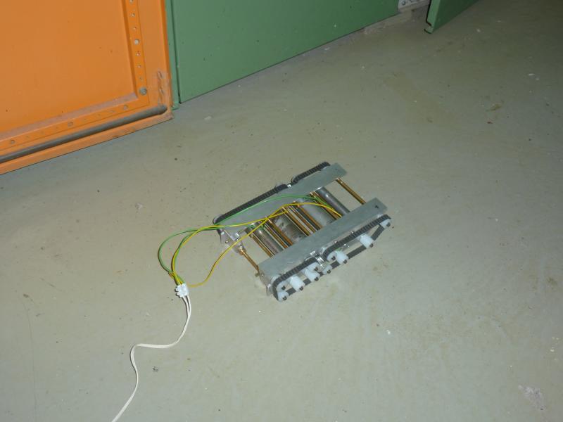Der Riemen läuft über das Zahnrad und und wird von den Rollen seitlich davon zurückgehalten, was Rutschen und somit ein Durchdrehen verhindert. Nachdem die andere Seite dranmotiert wurde, haben wir die Motoren an ein Netzgerät angeschlossen und es lief. Am Anfang ist der Riemen zwar noch runtergerutscht, aber das konnte durch ausprobieren an den Stellschrauben behoben werden.