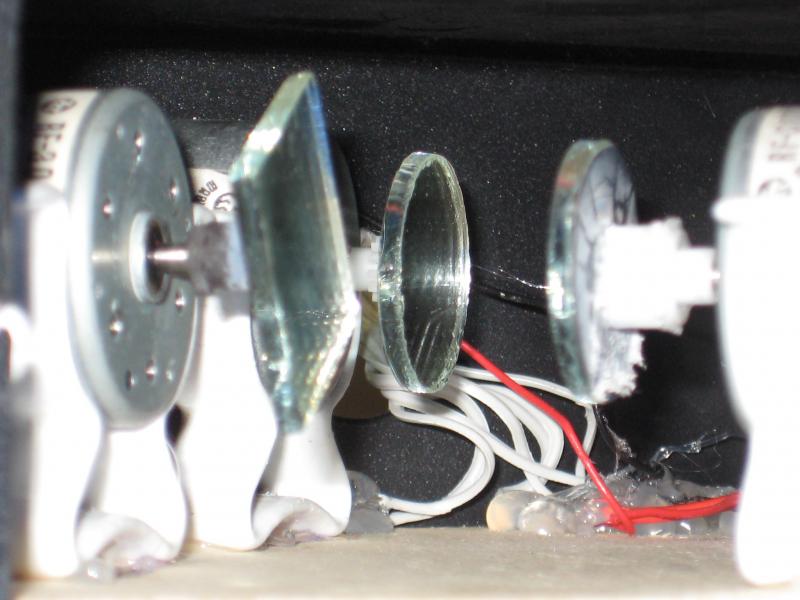 Der Laser stammt aus einem Laserpointer den ich zerlegt hab. Die Motoren kommen aus einem CD Laufwerk, die Spiegel sind von einem kaputten Mobilé.