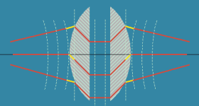 Dann könnte man die Röhren innerhalb der Linse schräg zur Gesamt-Ausbreitungsrichtung anbringen und durch die Richtungsänderung die Welle in dieser Gesamtausbreitungsrichtung verzögern. Man hat dann damit neben der Laufzeitverschiebung auch eine Ortsverschiebung der Anteile.