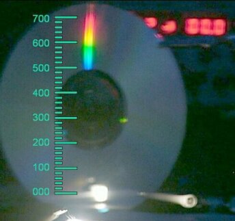 Im Bild sind die Reflexionen der beiden LEDs im Bild unten zu erkennen. Die beiden darüber liegenden Punkte sind die ersten Nebenmaxima der Beugung am CD Spurgitter, das sehr kostant ist und sich damit auch zum Messen der Wellenlänge eignet.