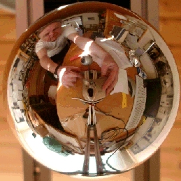 Vielleicht noch meine eigenen Bastelergebnisse. Ich habe dazu als sphärischen Spiegel eine normale kopfverspiegelte Glühlampe mit einer einfachen Digitalkamera fotografiert und das Bild mit einer freien unwarping-software (PUT 1.0) in eine 360° Ansicht umgewandelt. Das Bildmotiv zeigt mich in meinem wie immer unaufgeräumten Arbeitszimmer.