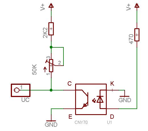 der Unterschied zu euren Schaltungen ist, das ich keinen Widerstand vor dem CNY70 Transistor habe, aber den braucht man doch eigentlich nicht