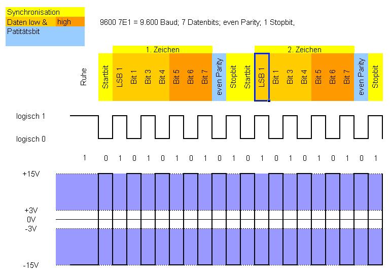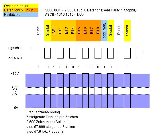 Nur die bedeutung bei der RS232 ist so, dass +12 V für eine 0 und -12 V für eine 1 stehen, wenn ich micht richtig erinnere.