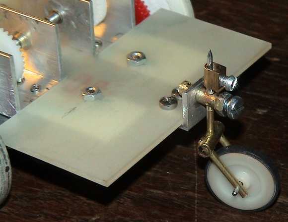 Auf der Suche nach einem Stützrad fand ich in einem alten Autoradiokassettenspieler eine "bereifte" Mitnehmerrolle (Bandandruckrolle war schon ausgeschlachtet). Die wurde mit einer 2mm Ø Messinghülse als Radnabe ausgerüstet.