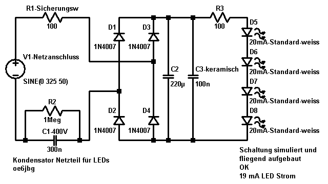 Ich versteh den Aufwand nicht, für kleines Geld bekommt man heute doch schon LED-Schaltnetzteile an die man ohne Probleme eine LED anschließen kann. Sauber aufgebaut und mit einem tollen Wirkungsgrad. Ich mein der Stromverbrauch ist ja immer so eine Sache als umweltbewusster Bastler sollte man den schon im Blick haben.