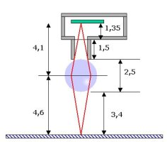 Sie liegen in einem sinnvollen Bereich, allerdings hätte mir für eine Glaslinse ein n = 1,5 besser gefallen, deshalb auch der Hinweis auf die realen Messwerte. So wie es aussieht ist in der Maus der Chip 4,1mm oberhalb der Linsenmitte was bei der Brennweite von 2,17mm zu einer Gegenstandweite zum Papier von 4,6mm führen würde. Ein bisschen unsymmetrisch aber dafür ist es mal eine durchgeführte Messung.