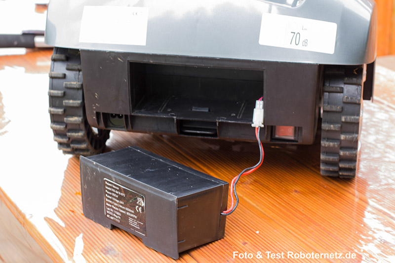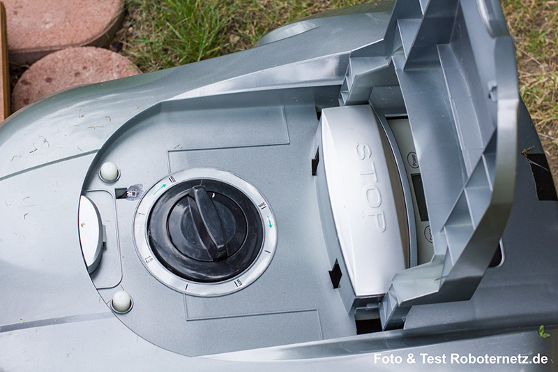 Der erste etwas enttäuschende Eindruck wurde vollständig bestätigt als ich feststellte das beim wackeln am Roboter ständig das große LI-Akku raus viel. Obwohl ich mehrfach das Akku richtig in die Halterung einrasten ließ, führte bereits leichte Kippbewegungen des Roboters wieder dazu das dieses heraus viel. Unglaublich: Durch leichte Kunststoffverformungen oder Toleranzen war die Akku Halterung einfach nicht geeignet um den Akku stabil zu halten. Sehr schön dagegen gefiel mir die bequeme und einfach zu verwendende Schnitthöhenverstellung, die über ein Drehregler hinter einer Klappe versteckt war.