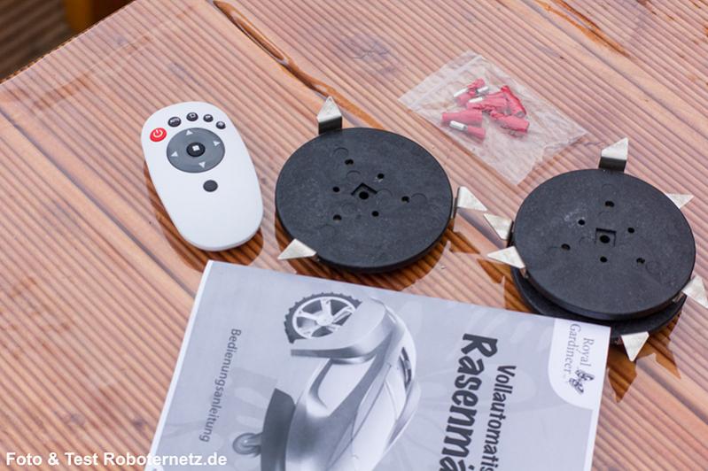Durch das Kunststoffgehäuse wirkt der Roboter ein wenig billig und zerbrechlich, was aber nicht wirklich der Fall ist da ein recht stabiler und bruchfester Kunststoff verwendet wurde. Das Schneidesystem besteht aus drei schnell rotierenden Messern die quasi aus drei Plastikscheiben mit zwei Metallklingen an den Seiten bestanden. Diese wirkten durchaus recht stabil und zuverlässig. Durch die nebeneinander angeordneten Messer ergab sich auch eine Schnittbreite von 32cm, was schon sehr ordentlich ist. Natürlich ist auch dieser Roboter nur für das sogenannte „Mulchen“ geeignet. Das bedeutet er eignet sich nur für kürzeren Rasen mit maximal 10cm Höhe. Das Rasenschnittgut wird durch die Messer soweit zerkleinert, das es quasi als Dünger auf dem Rasen liegen bleibt. Die im Umfang enthaltene Fernbedienung war dermaßen winzig, das sie erst gar nicht gefunden wurde. Nicht nur die winzige Größe sondern auch das zerbrechlich wirkende Batteriefach und der verwendete Kunststoff machten einen sehr billigen Eindruck, bei einem 699 Gerät hatte ich hier mehr erwartet. Noch dazu benötigt die Fernbedienung eine recht spezielle 12V Batterie vom Typ 23AE. Die Batterie war zudem nicht im Lieferumfang enthalten, obwohl diese laut Handbuch dabei sein sollte. Auch die Basis Station machte durch ihr Leichtgewicht (innen hohl) und einfachen Aufbau nicht unbedingt sonderlich hochwertig.