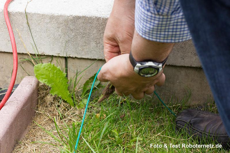 Hat man dafür eine Lösung gefunden, so muss man das Begrenzungskabel verlegen. Im Test habe ich etwa 60m den Begrenzungskabel verwendet um eine ebene Rasenfläche und ein kleines Stück einer ca. 29 Grad Steigung einzuzäunen. Das Kabel ließ sich recht bequem mit den mitgelieferten Bodenankern verlegen, man musste nur darauf achten das es tief am Boden liegt, denn sonst könnte es der Roboter selbst zerschneiden. Trotzdem gingen für die ganzen Vorbereitungen schon ca. 2-3 Stunden drauf. Danach wurde der Roboter geladen, was ebenfalls über das Basis Netzteil möglich war. Da der Akku offenbar vorgeladen war, dauerte das nur ca. 1 Stunde.
