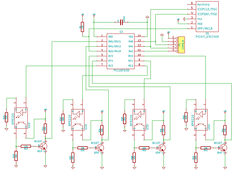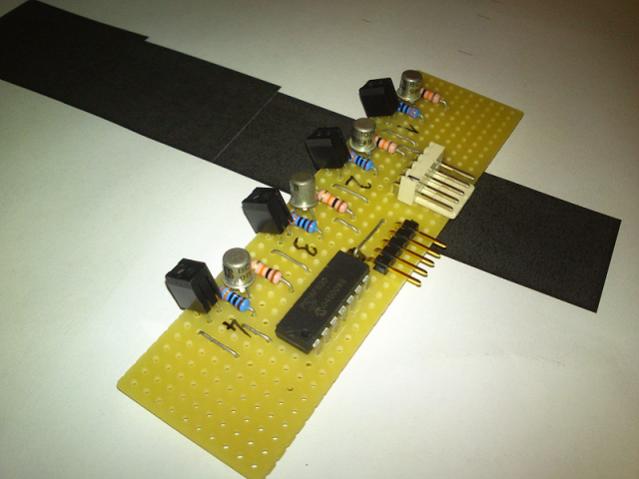 Im Testaufbau funktioniert die Schaltung schon mal ganz gut. Der PIC schaltet die 4 IR LEDs der Sensoren nacheinander ein, und wertet das Signal der Phototransistoren aus. Das Quellcode in C für XC8 und PIC16F630 ist angefügt.
