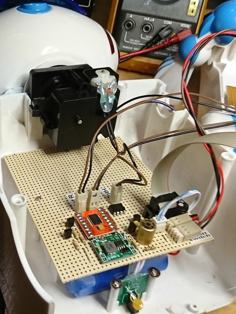 Die Steuersignale sollen von der MCU kommen, verbunden über 10poliges Flachbandkabel mit Wannenstecker. Zum Test der Motoransteuerung und Drehrichtungen gebe ich die Signale händisch über Taster auf Breadboard vor. Der Kopf und die Fahrantriebe laufen rund und der Roboter bewegt sich mit schätzungsweise 50cm/s recht flott.
