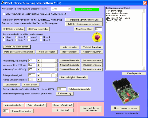 - Ein mitgelieferter Steuerprogramm erlaubt die Ansteuerung der Schrittmotoren bequem per Mausklick. Durch die Möglichkeit unterschiedliche Ströme und Geschwindigkeiten einzustellen, lassen sich Schrittmotoren auch optimal austesten.