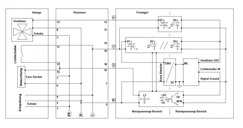 Ein MC steuert die Einschaltzeiten von einem 230 V Lüfter für Sanitärräume. Die Zeiten werden ausgelöst durch Einschalten und Ausschalten der 230 V Spannung an der Beleuchtung. Die Versorgung des MC läuft nicht dauernd, sondern sondern erst bei Bedarf! Die Ausführung erfolgt in Schutzklasse 2: Schutzisolierung.