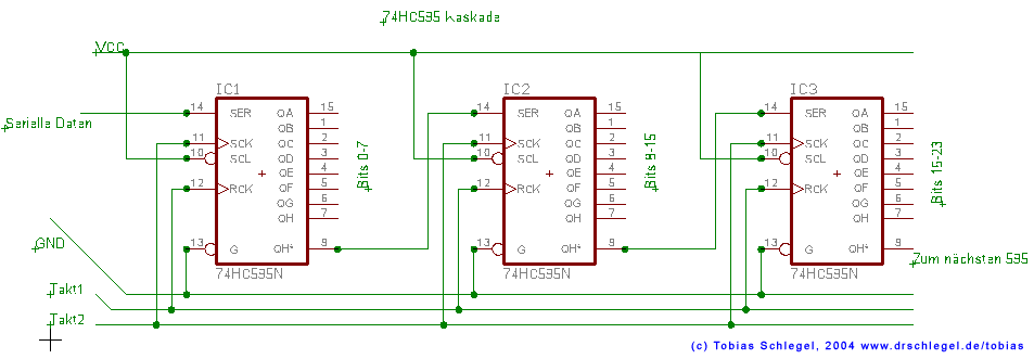 Die Signalleitungen sind SER1, SER2, SER3. Der SER-Ausgang von IC7 (Pin9) wird nicht weiter verwendet. Wenn du in Modulbauweise baust, kannst du den auch rausführen auf nen Stecker (mit Vcc,GND,RCK,SCK,Power-VCC) und nochmal Module hintendranhängen. Die Ausgabemodule sind ja alle baugleich.