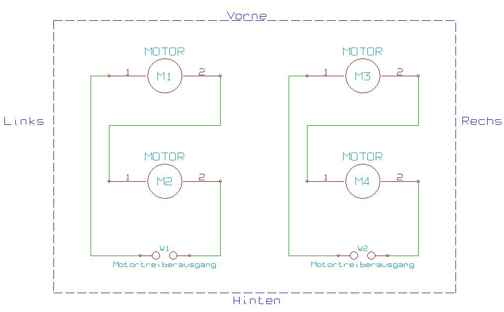 Da die Drehzahl eines Motors proportional zur angelegten Spannung ist, ist auch die Summe der Spannungen an zwei Motoren proportional zur Summe der Drehzahlen.