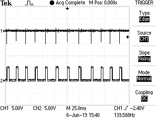Die Oszillogramme zeigen Kanal 1 an Pin 8 vom CD4093, Kanal 2 an rechter Seite von R4, also das Signal daß zum µC geht. Kanal 1 ict AC gekoppelt. +5V Gleichspannungsanteil dazu rechnen.