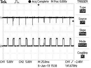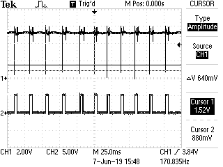 Die Oszillogramme zeigen Kanal 1 an Pin 8 vom CD4093, Kanal 2 an rechter Seite von R4, also das Signal daß zum µC geht. Kanal 1 ict AC gekoppelt. +5V Gleichspannungsanteil dazu rechnen.