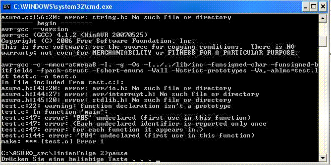 ich weiß jetzt wo der Fehler lag. Die Pfadangabe zu WinAVR war nicht ganz richtig. Der ordner heißt ja WinAVR20070525. die Funktionierende Version heißt jetzt also:Code::: set environment variables for WinAVR toolset set WINAVRDIR=C:\WinAVR20070525 set PATH=%WINAVRDIR%\bin;%WINAVRDIR%\utils\bin;%PATH% set GCC_ROOT=%WINAVRDIR% set BINUTILS_ROOT=%WINAVRDIR% make all